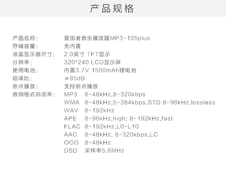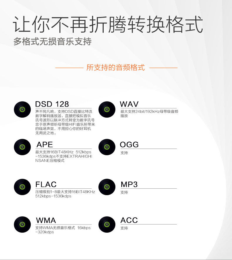 - 音頻播放格式:MP3DSDDFFDSFWMAWAVOGGAPEFLAC
