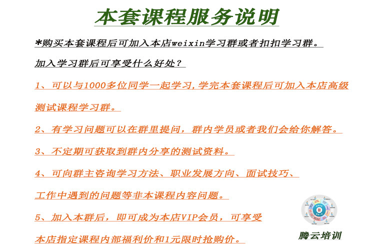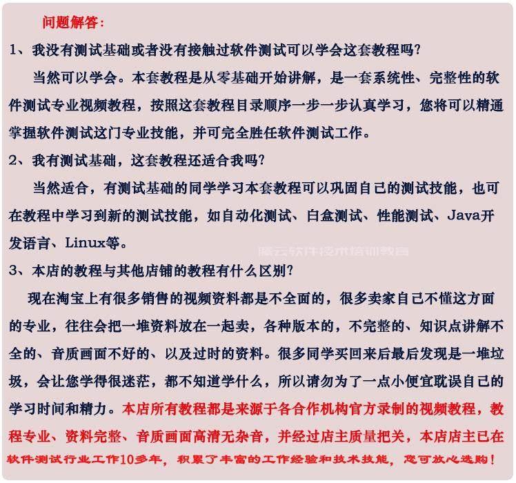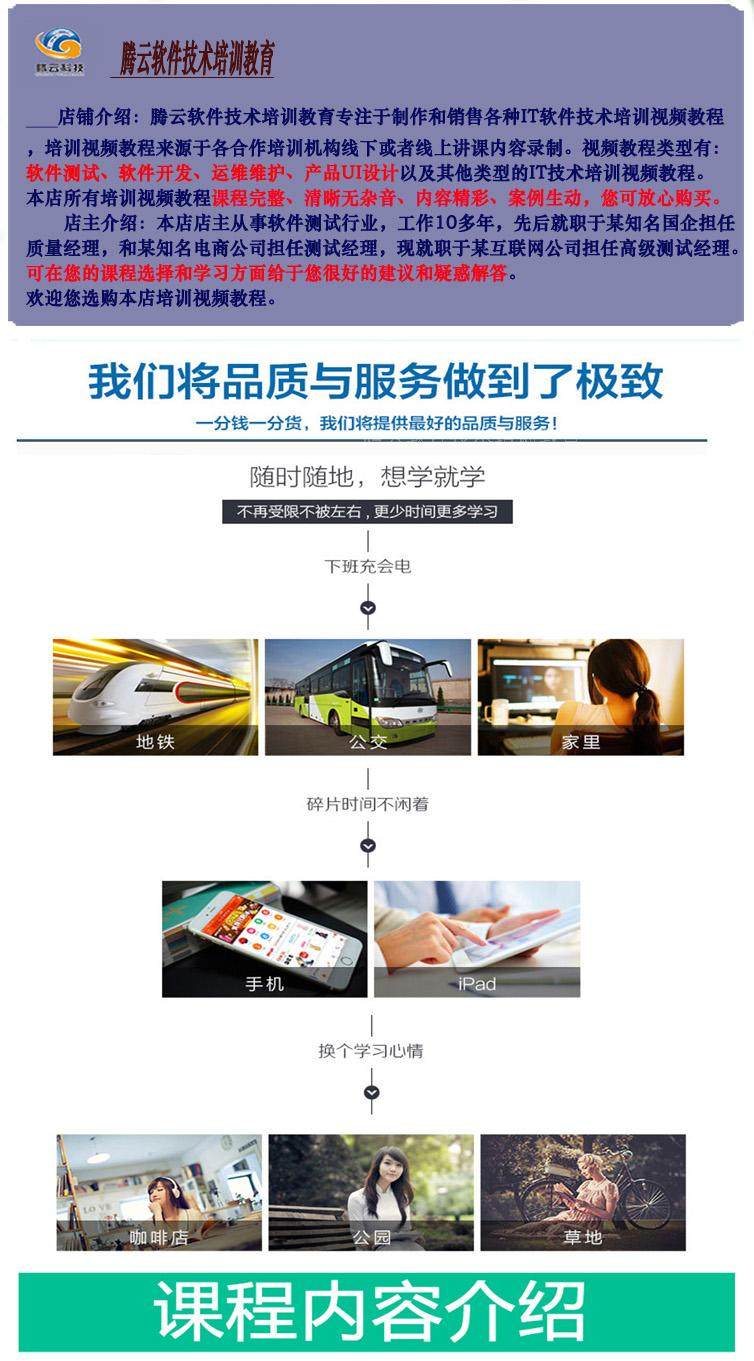 本套課程根據(jù)線下軟件測(cè)試培訓(xùn)班上課錄制! 這套課程在線下培訓(xùn)班價(jià)格是(咨詢特價(jià))!參加過軟件測(cè)試培訓(xùn)的都知道。您在本店只花費(fèi)一本書的價(jià)錢即可買到。買到即是賺到,學(xué)完本套軟件測(cè)試教程,實(shí)現(xiàn)您IT高薪夢(mèng)。