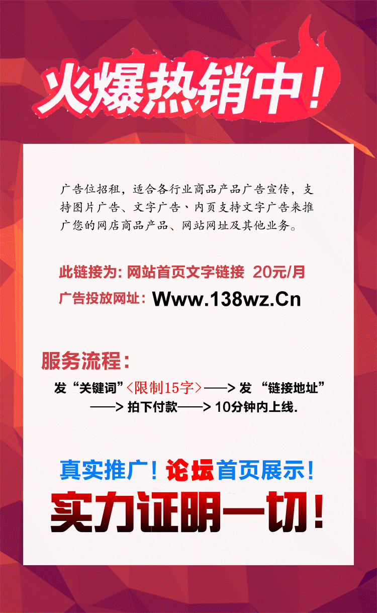 論壇網(wǎng)站廣告位招租,適合各 行業(yè)商品產(chǎn)品廣告宣傳,可以投放圖片廣告、文字鏈接廣告來推廣您的網(wǎng)店商品產(chǎn)品、網(wǎng)站網(wǎng)址及其他業(yè)務(wù)。