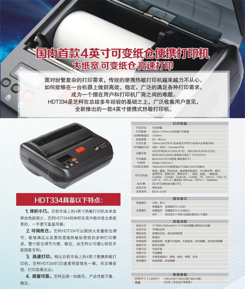 芝柯HDT334升級版便攜式熱敏小票不干膠標簽藍牙/WIFI/USB打印機